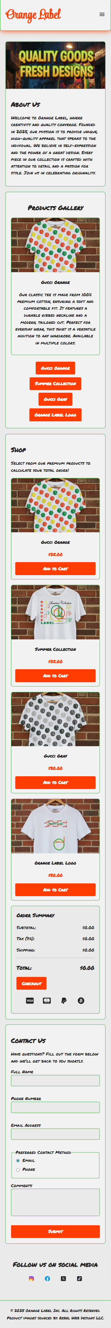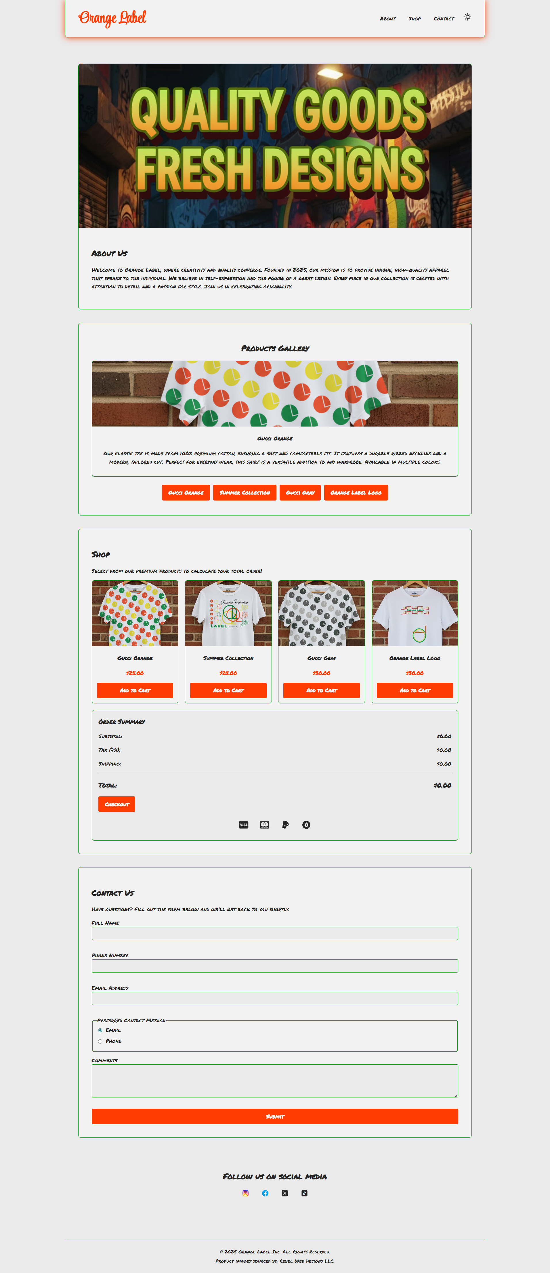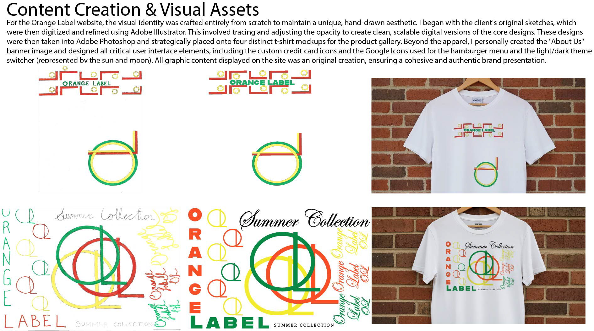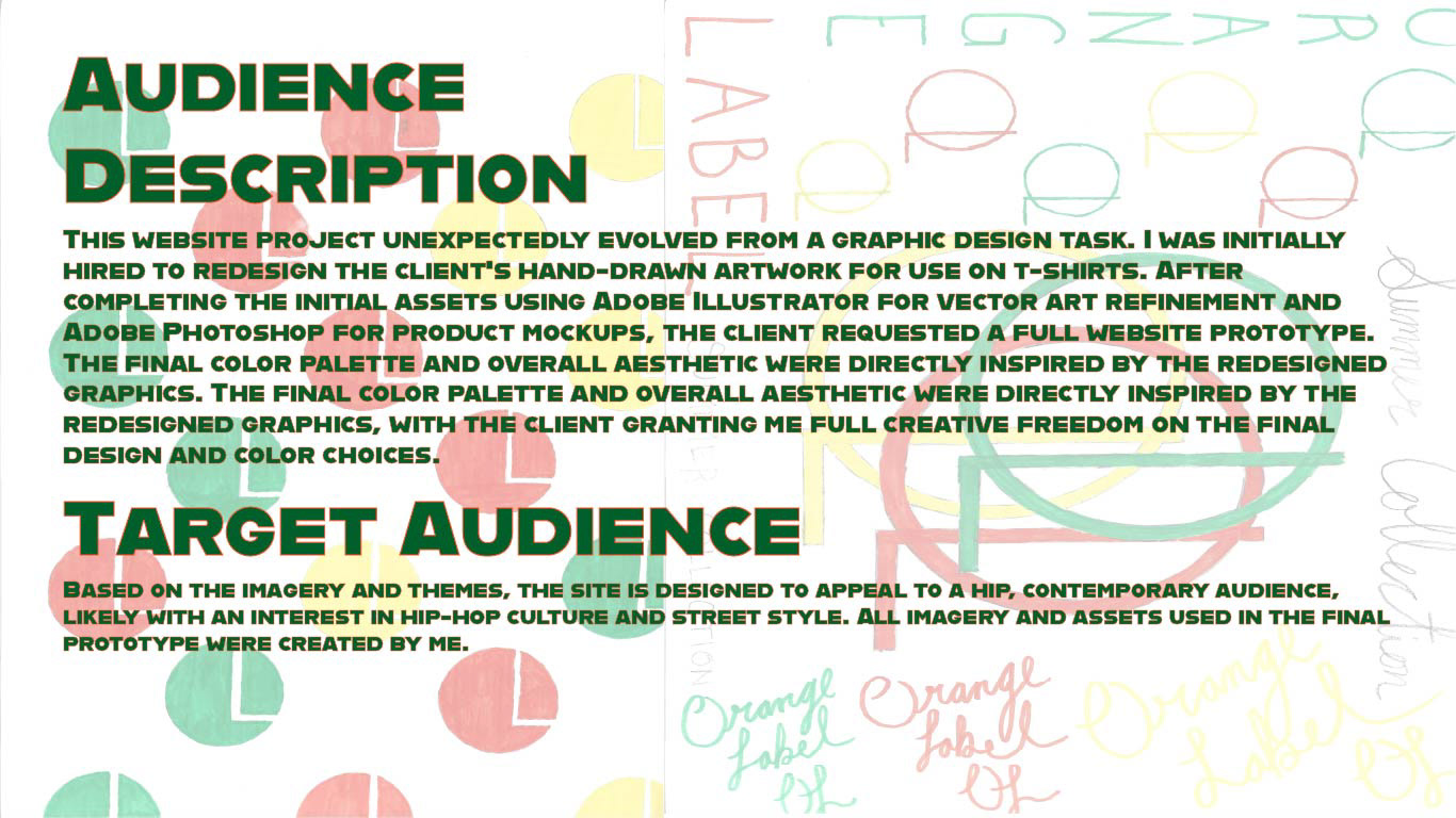 This web development project began as a client prototype for the clothing brand Orange Label. The initial brand assets were client sketches, which I took through a full digital design pipeline. This involved redesigning and vectorizing the artwork in Adobe Illustrator, and then creating high-fidelity apparel mockups in Adobe Photoshop. While direct client interviews are pending, this prototype successfully digitizes the brand's vision, providing a functional foundation for their future e-commerce site.