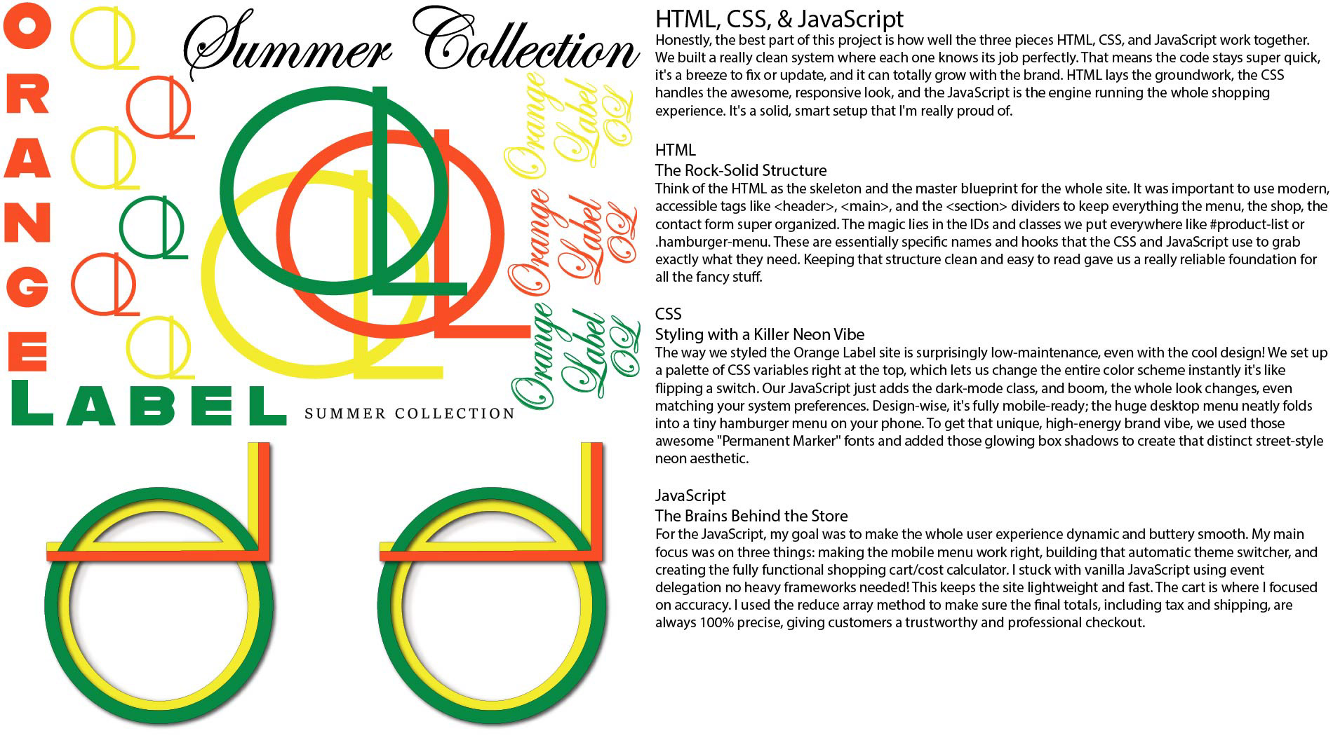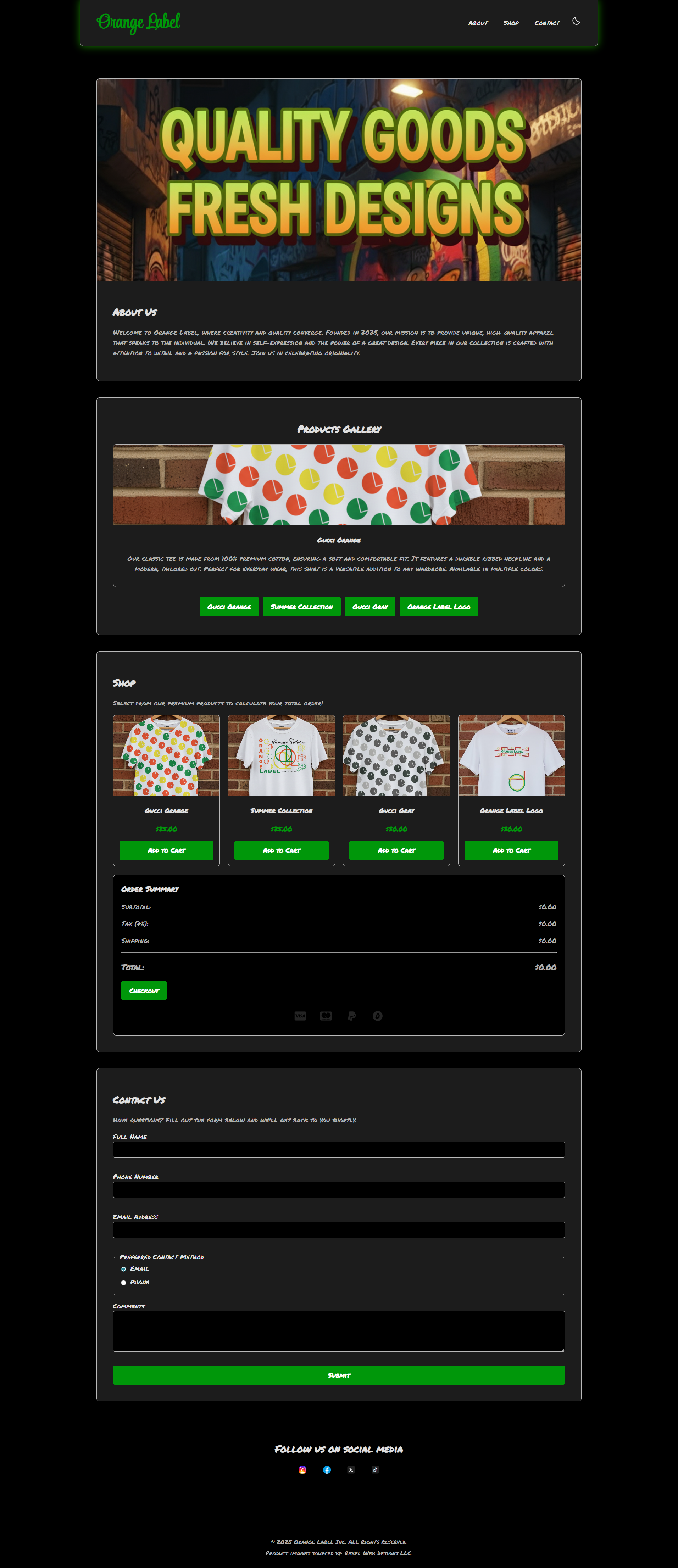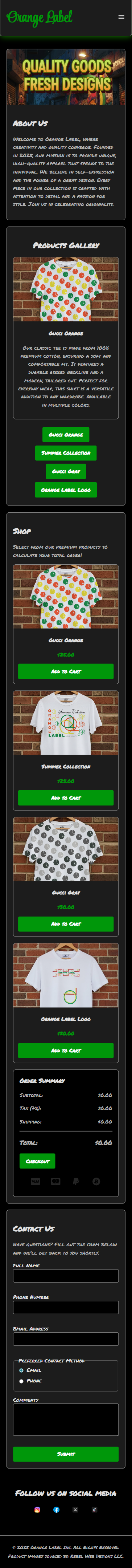 This web development project began as a client prototype for the clothing brand Orange Label. The initial brand assets were client sketches, which I took through a full digital design pipeline. This involved redesigning and vectorizing the artwork in Adobe Illustrator, and then creating high-fidelity apparel mockups in Adobe Photoshop. While direct client interviews are pending, this prototype successfully digitizes the brand's vision, providing a functional foundation for their future e-commerce site.